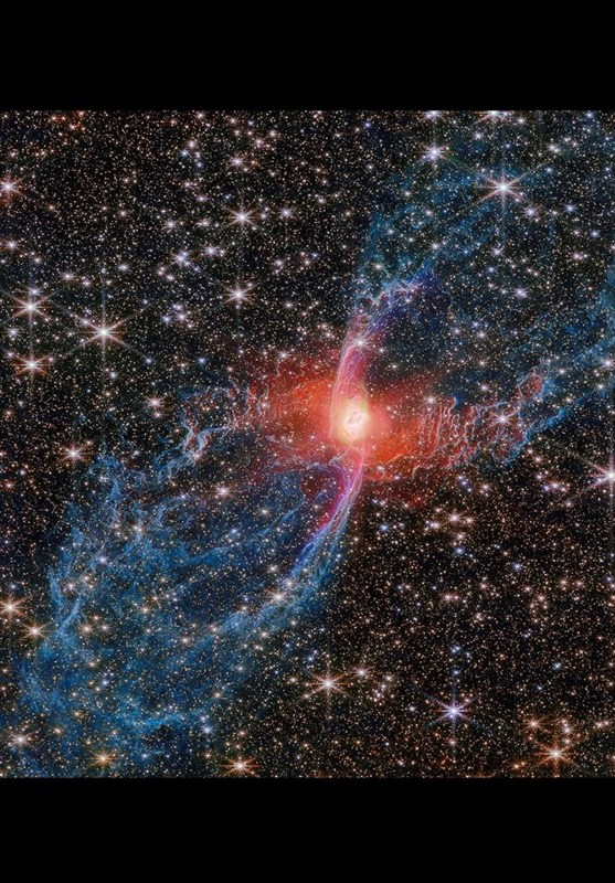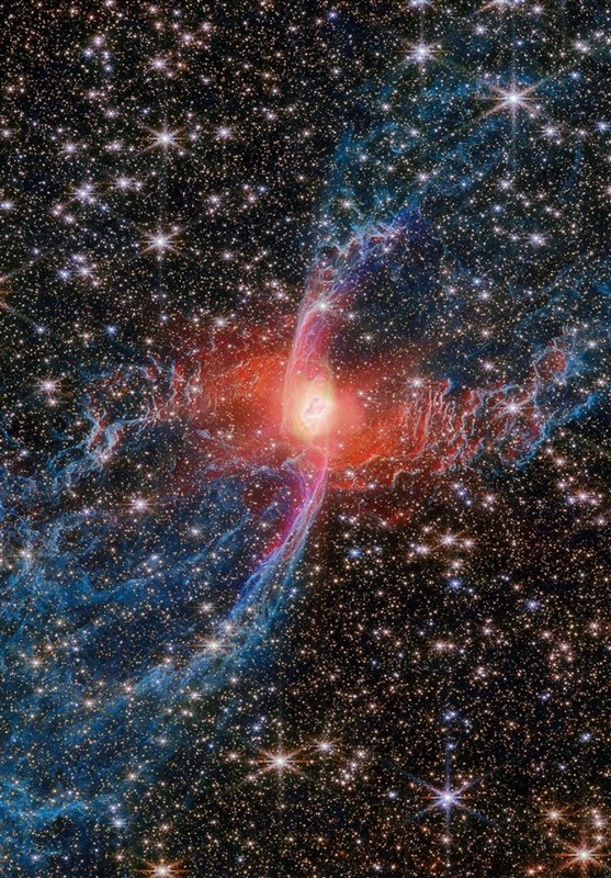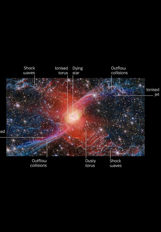 در این مجموعه از تصاویر، ستاره مرکزی سحابی در میان حلقههایی از هیدروژن مولکولی با سرعتی معادل سه سالنوری در طول عمر خود دیده میشود؛ ساختاری پیچیده و چشمنواز که در نمای برچسبدار (TAG) وب میتوان جزئیات دقیق آن را مشاهده کرد. بخشهای سرخرنگ و امواج شوک اطراف سحابی، به گفته دانشمندان، نشاندهنده پایان عمر ستاره و فرآیند شکلگیری سحابی جدید است؛ پدیدهای که به اخترشناسان در فهم بهتر چرخه زندگی ستارگان یاری میرساند.